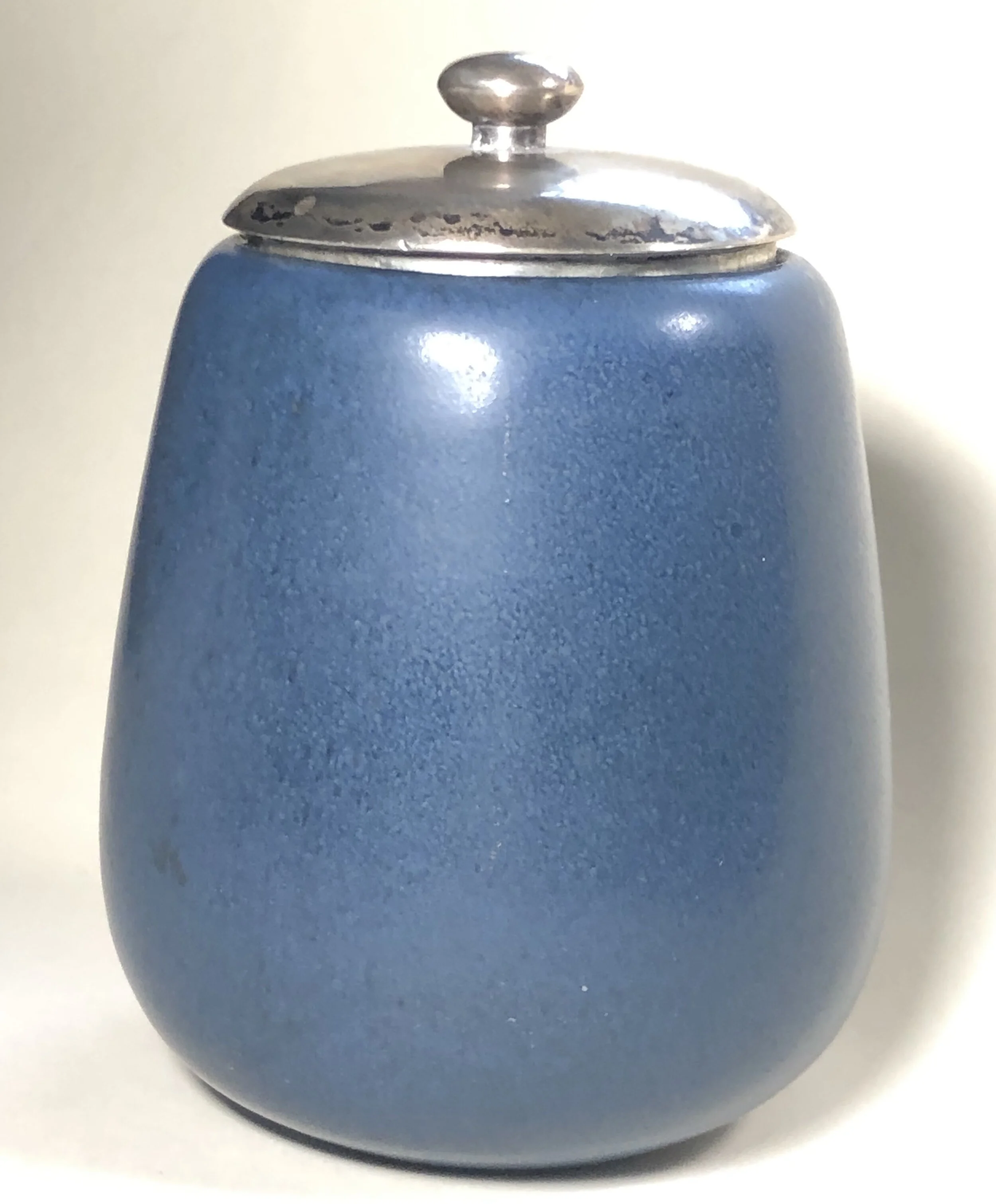 Here's a wonderful original Marblehead Pottery covered piece, which I believe may have been designed as a tea jar. It measures just about 4" high and is done in a great blue glaze. It is in EXCELLENT condition. The bottom shows the 3 kiln marks & one is a little larger than normal. This is NOT a chip & definitely occurred in the making.