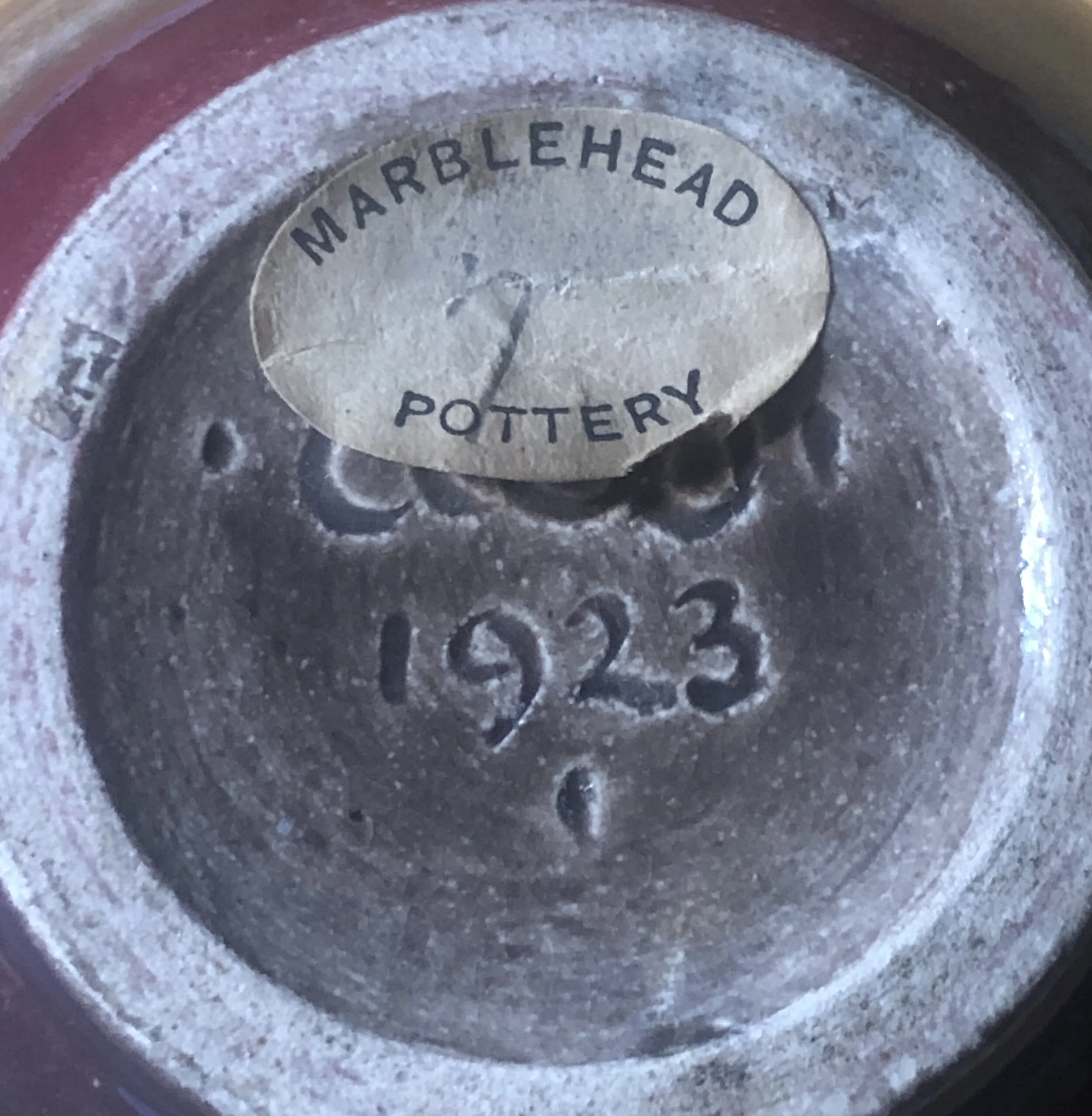 Marblehead Pottery Paper Label with the number 7, 1923 AEB (Arthur E Baggs) Signature, Note - there is no MP Ship Mark on the small base - too small to hold impressed mark and signature
