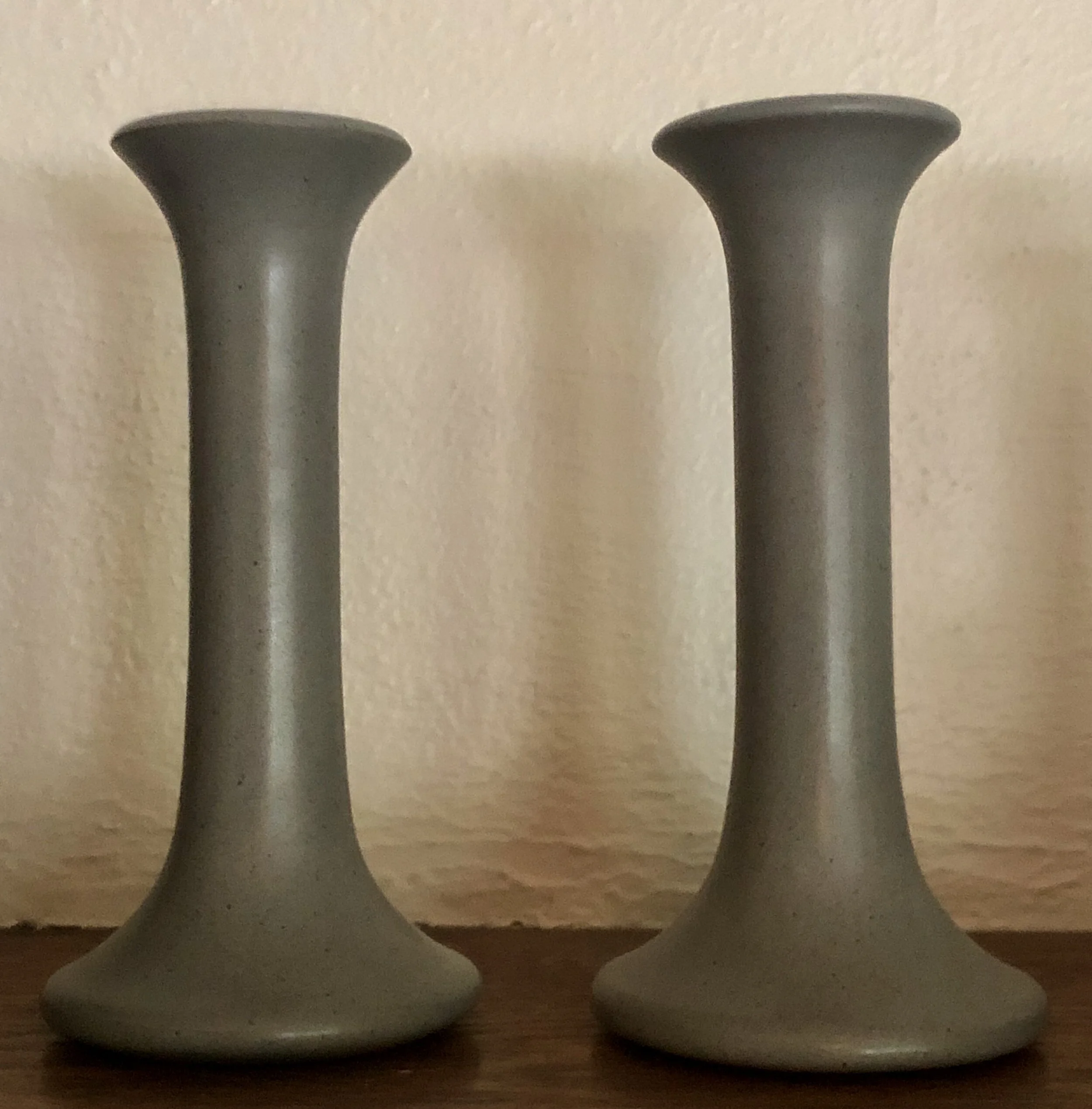 Marblehead Pottery Piece # 435 Pair of Gray Candlesticks, 6 & 1/2 Inches, Impressed MP Ship Mark on Each, Full Paper label on One, Partial Label on Other, Gardenali, Piece 434 Piece 436
